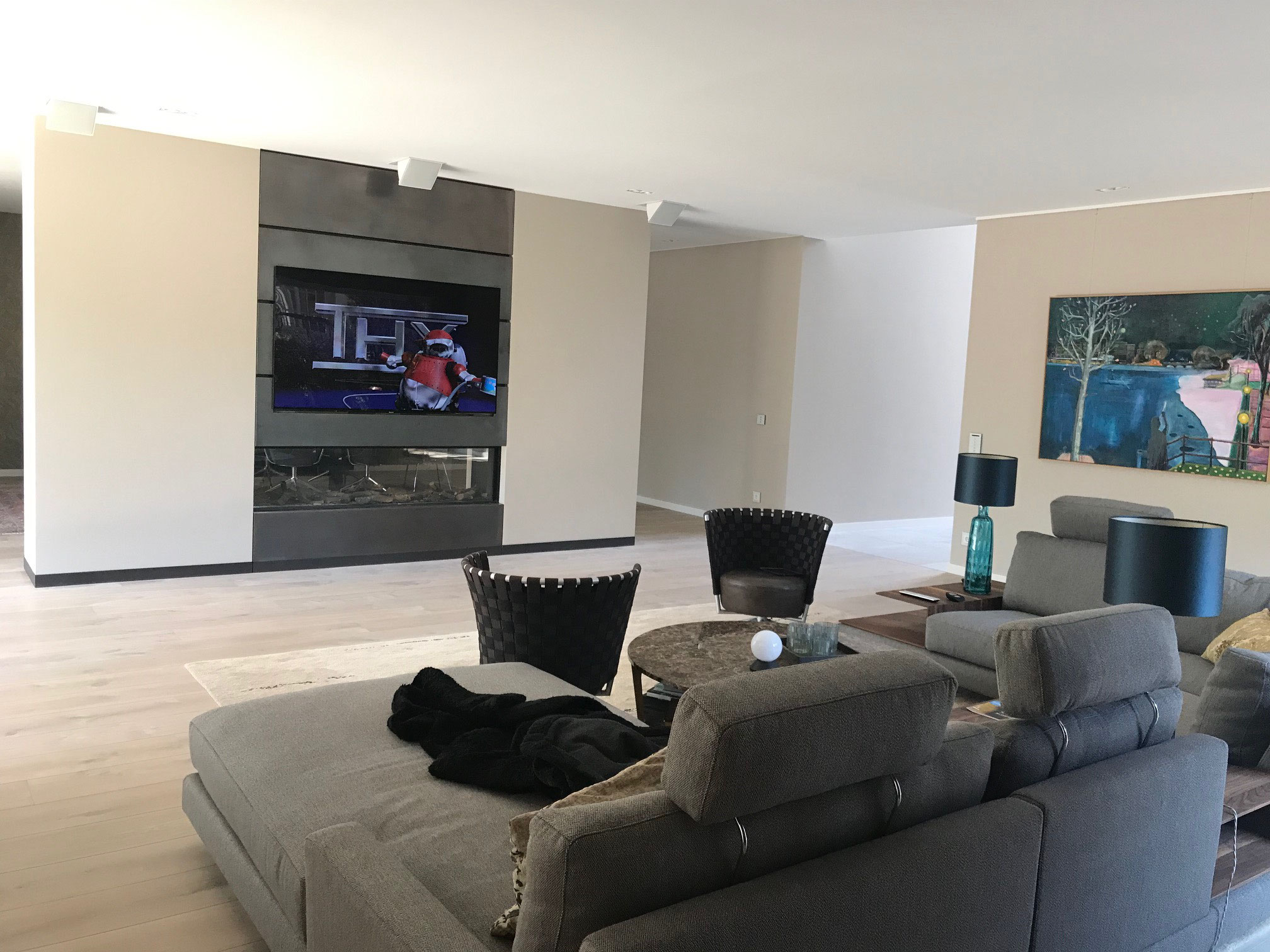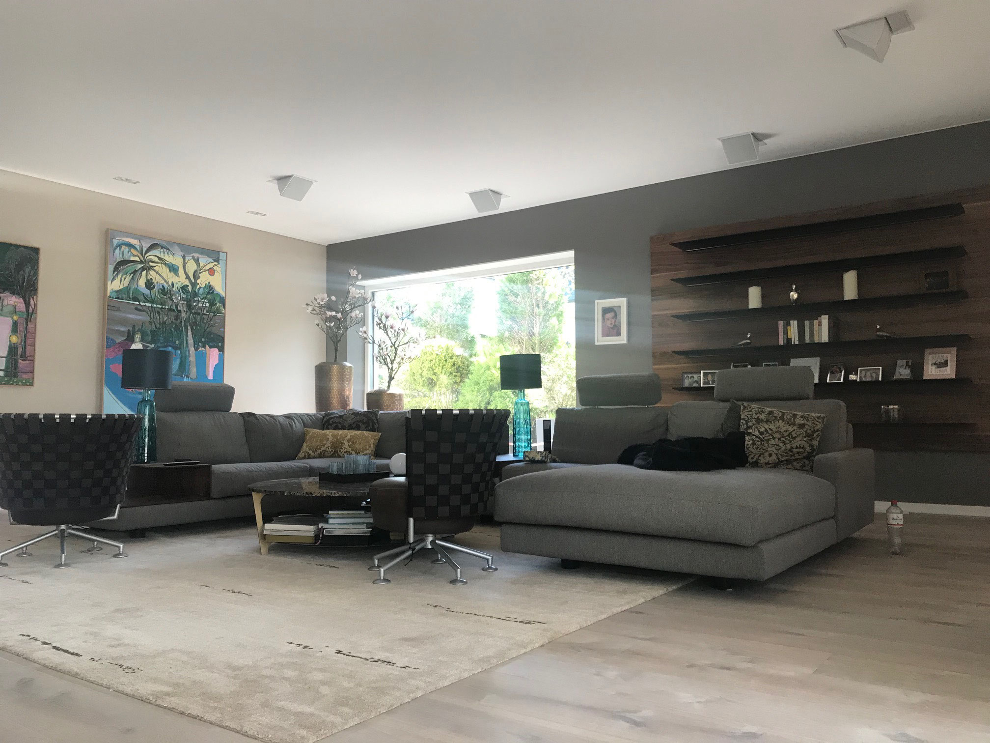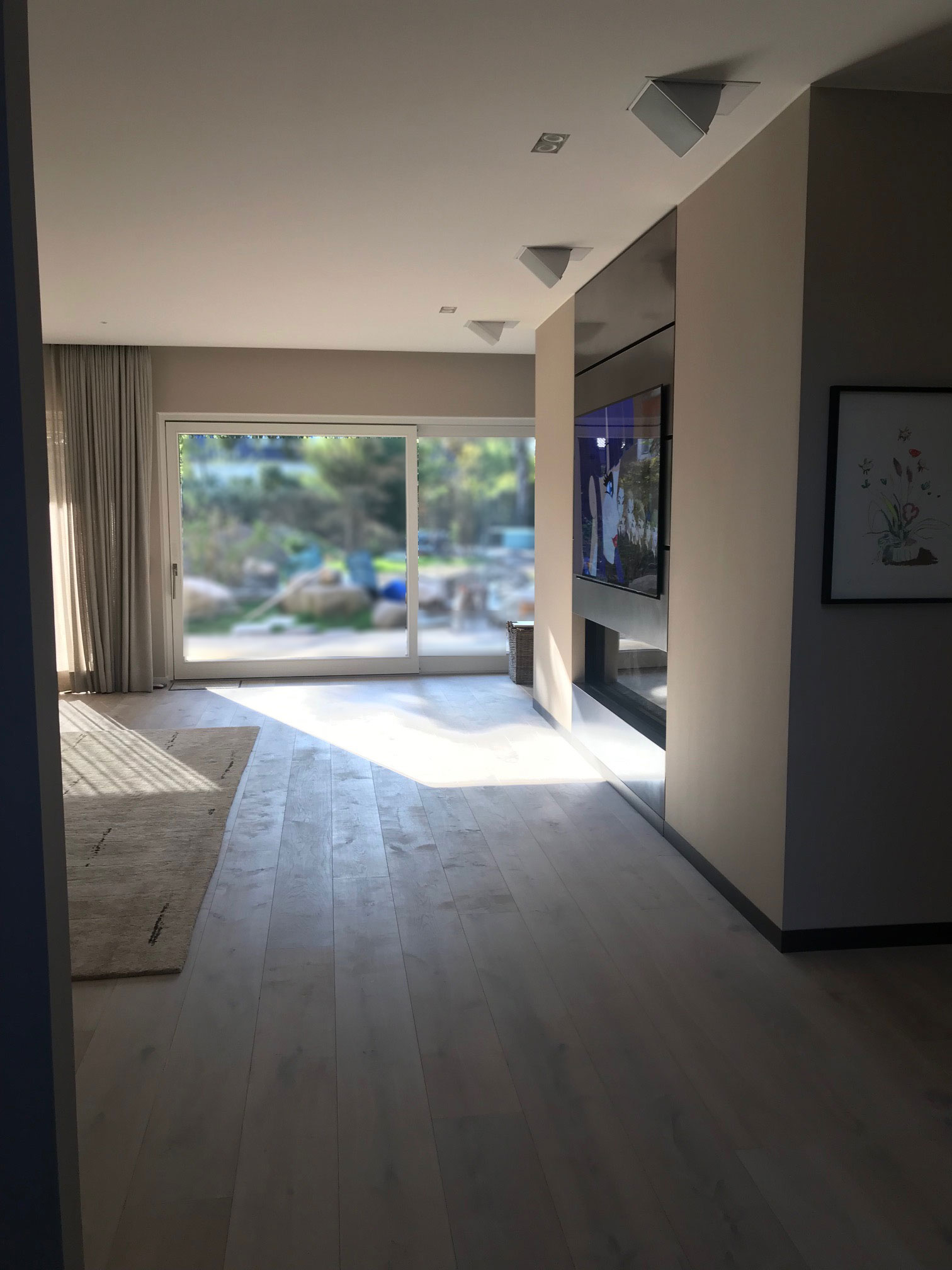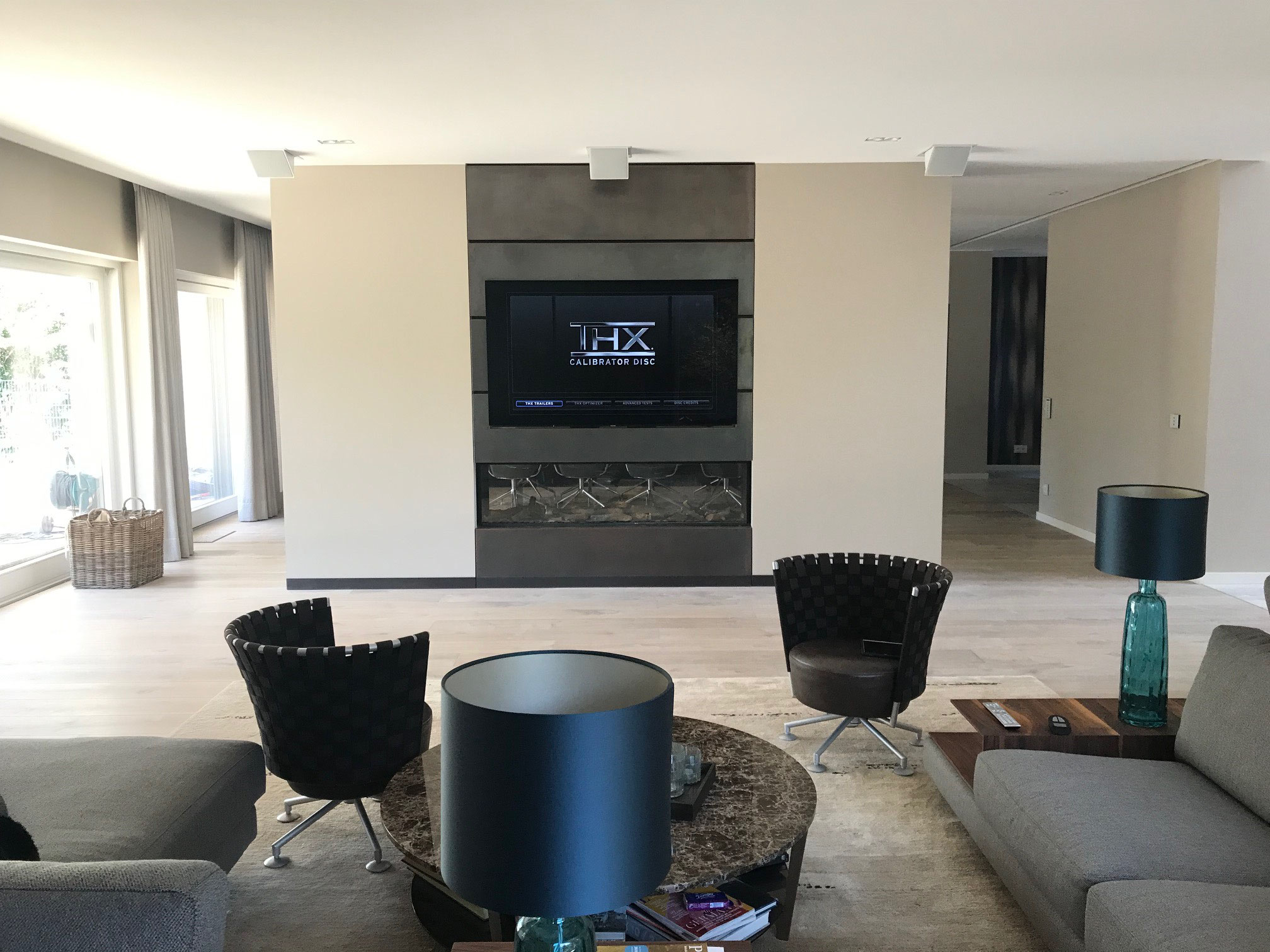 Durchweg Decken- und Wand-integrierte Lautsprechertechnik. Unsichtbare Verstärker- Zuspieler und Steuerungstechnik, schönes Licht und auch ein gut 70qm großes Wohnkino im Untergeschoss, TV und Tongenuss auch in Sauna und Gym oder etwa motorisch ausfahrbare Deckenlautprecher lassen erahnen...das es sich hier gut wohnen lassen wird.
